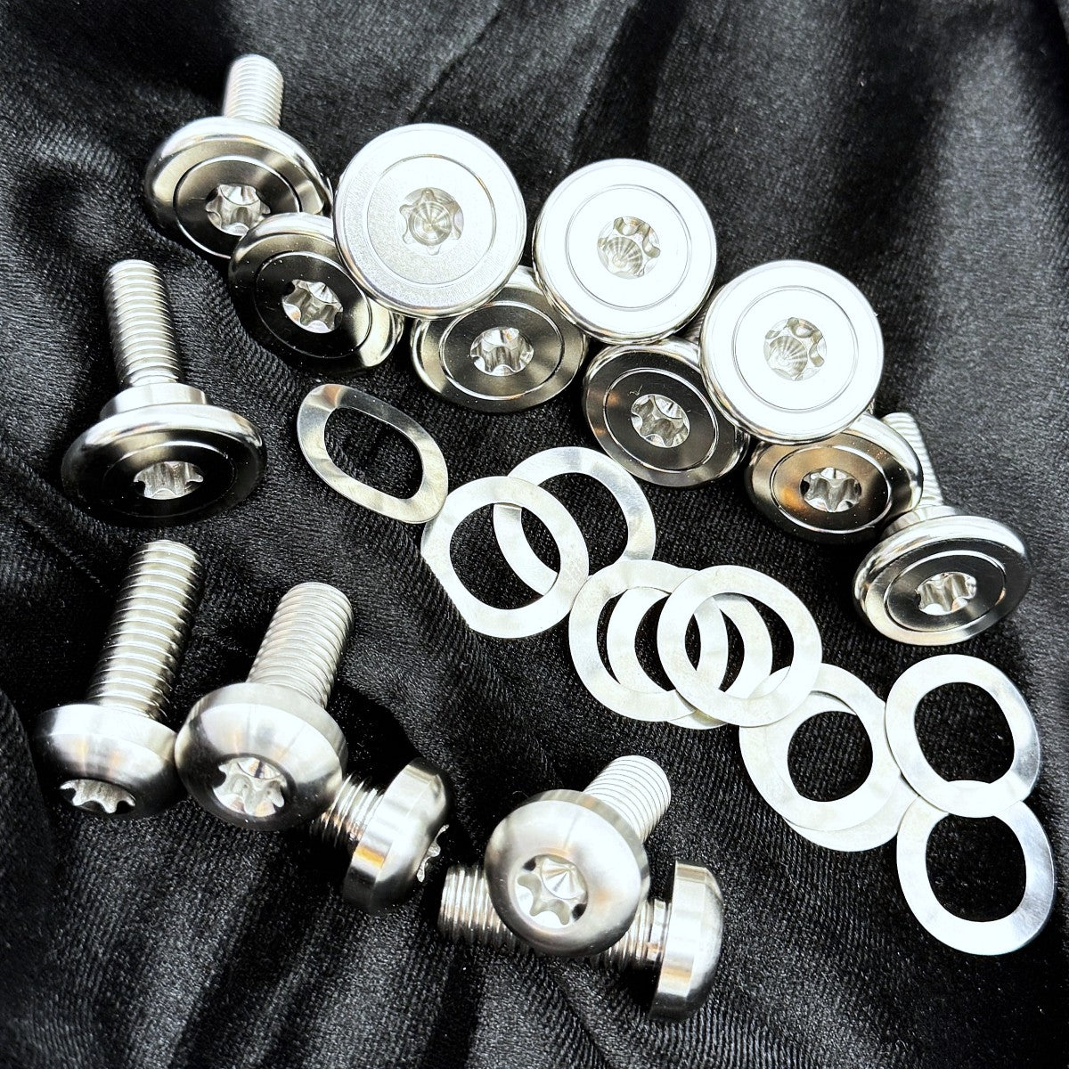 - Includes 10 GR5 titanium bolts, 10 stainless steel spring washers and 5 GR5 titanium 3/8" rear rotor bolts