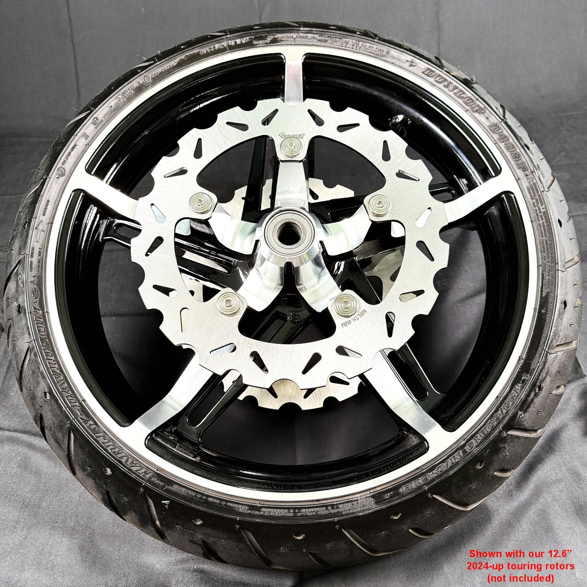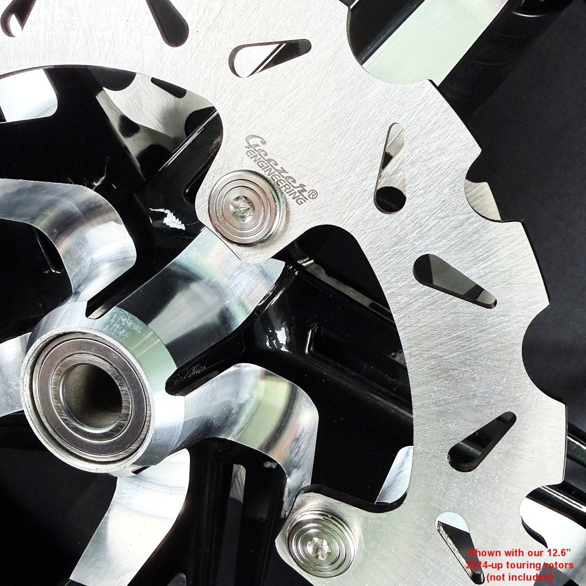 - Our rotor bolts are designed to replace OEM rotor bolts, spacers and springs used on 2014 - 2023 and 2024-up touring models. Please note that these bolts will only fit spoke-mounted rotors as used on OEM wheels such as the ‘Enforcer’, ‘Impeller’ (2014-2023) and 'Helix' wheels 2024-up that are set up for the same type of one-piece floating rotor. Please contact us if you're unsure which wheels you have.